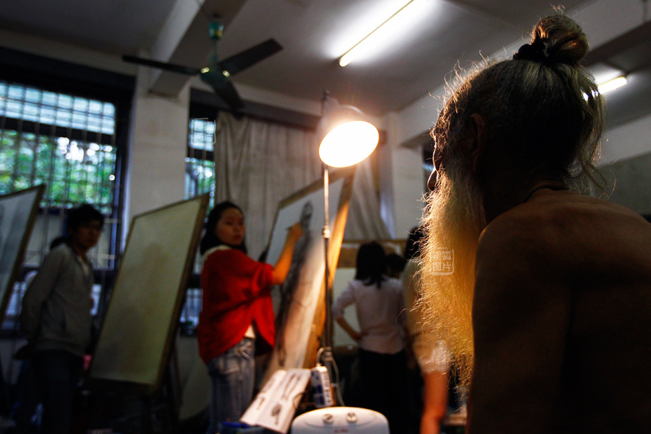 老李一动不动地维持一个姿势坐在学生前做人体模特,灯光下,他的白胡子显得更加晶莹。刚来广州时,老李以拾荒为生。给予他“新生命”的,是一名叫张力的广州美院学生,她将这个老农民,带到了广州美术学院。那是1995年,老李开始了做人体模特的艺术生涯。老李说:“我的新生命,是从75岁开始的。”