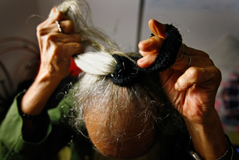 老李在梳自己的头发。没想到他自己留了长发和胡子后,反而成了他的招牌,名声也传开了。于是老李的胡子和长发,一留就留了十多年。自从5年前在老家的老伴去世后,老李就很少回老家。之前一直寄钱回家,盖了两层房子,资助了几个孙子上大学的老李,现在赚到的钱,他却基本都留在身边。虽然儿孙满堂,但是老李称他们都不愿意养他。 “回去就知道跟我要钱。”人总要落叶归根,老李说,啥时候干不动了,就回家去。