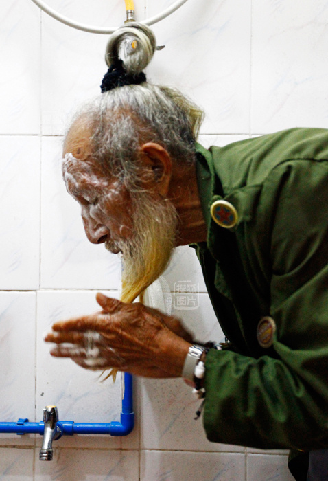 老李每天都会精心梳洗保养自己的胡子头发。回到家后,这个精瘦的老人,会用肥皂清洗他那一尺多长的白胡子,还有扎成发髻的辫子,然后仔细梳理。这是他的“揾食饭碗”。